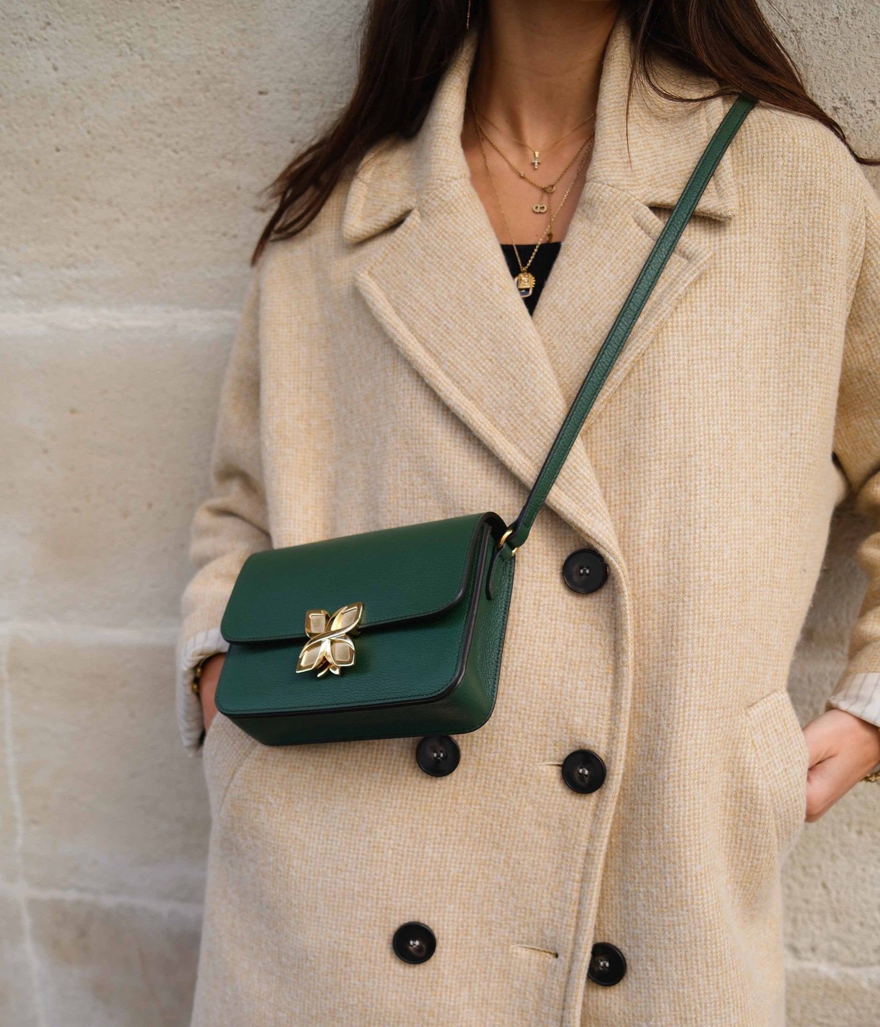 Its deep, natural Vert Sapin pairs beautifully with neutral tones like ivory, beige, or light grey for a harmonious, sophisticated look. For a bolder and more contemporary contrast, it also complements shades like burgundy, midnight blue, or camel, enhancing the richness of the green.