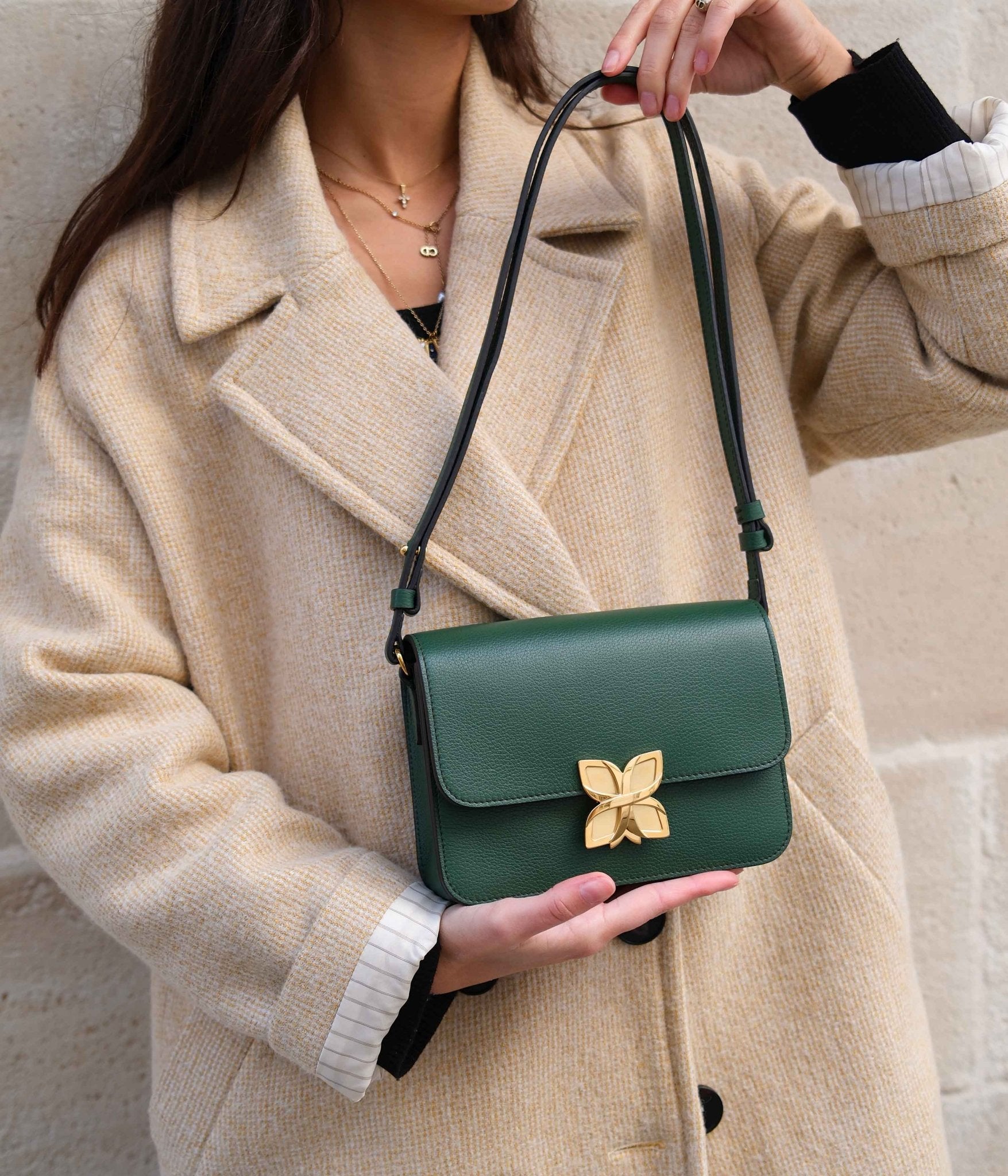 Let yourself be charmed by the elegant depth of the Mini Hortensia in Vert Sapin, crafted from fine-grained calf leather that blends intensity with refinement. Carefully handmade in our Italian ateliers, this accessory reflects the richness of exceptional craftsmanship and the elegance of a timeless design.